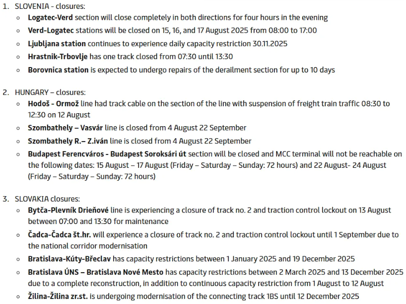 • A freight train carrying bulk cargo derailed at Borovnica station, Slovenia on August 10, 2025 (03:00 local time)